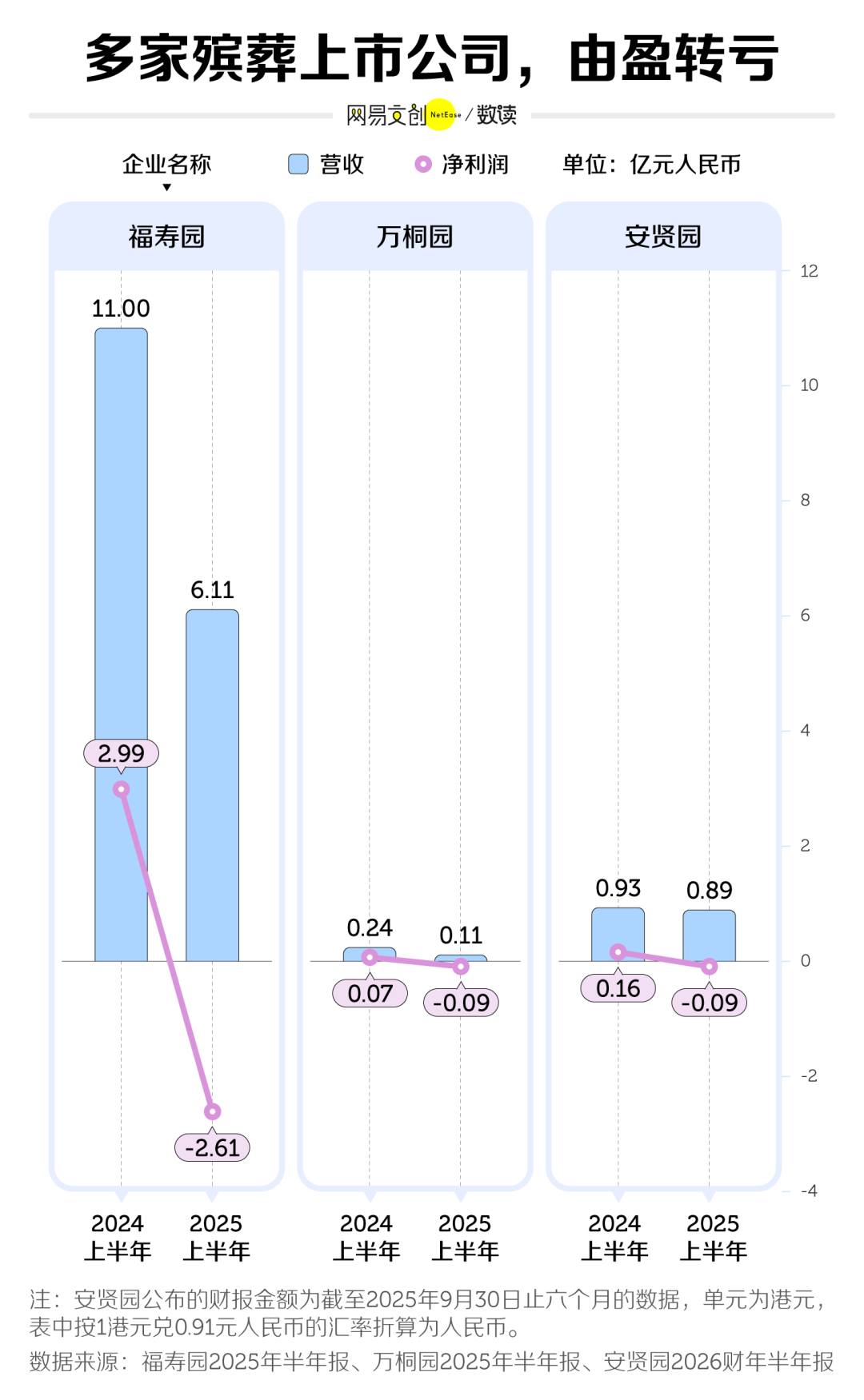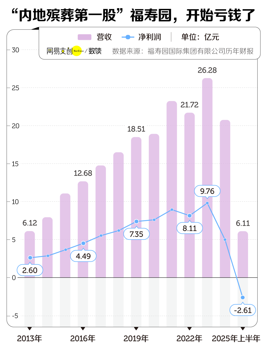 但从那之后,福寿园的功绩就急转直下,2024 年营收下滑,2025 上半年营收同比连接减少约 44.5%,净亏蚀 2.61 亿元,成为上市以来的初度亏蚀。